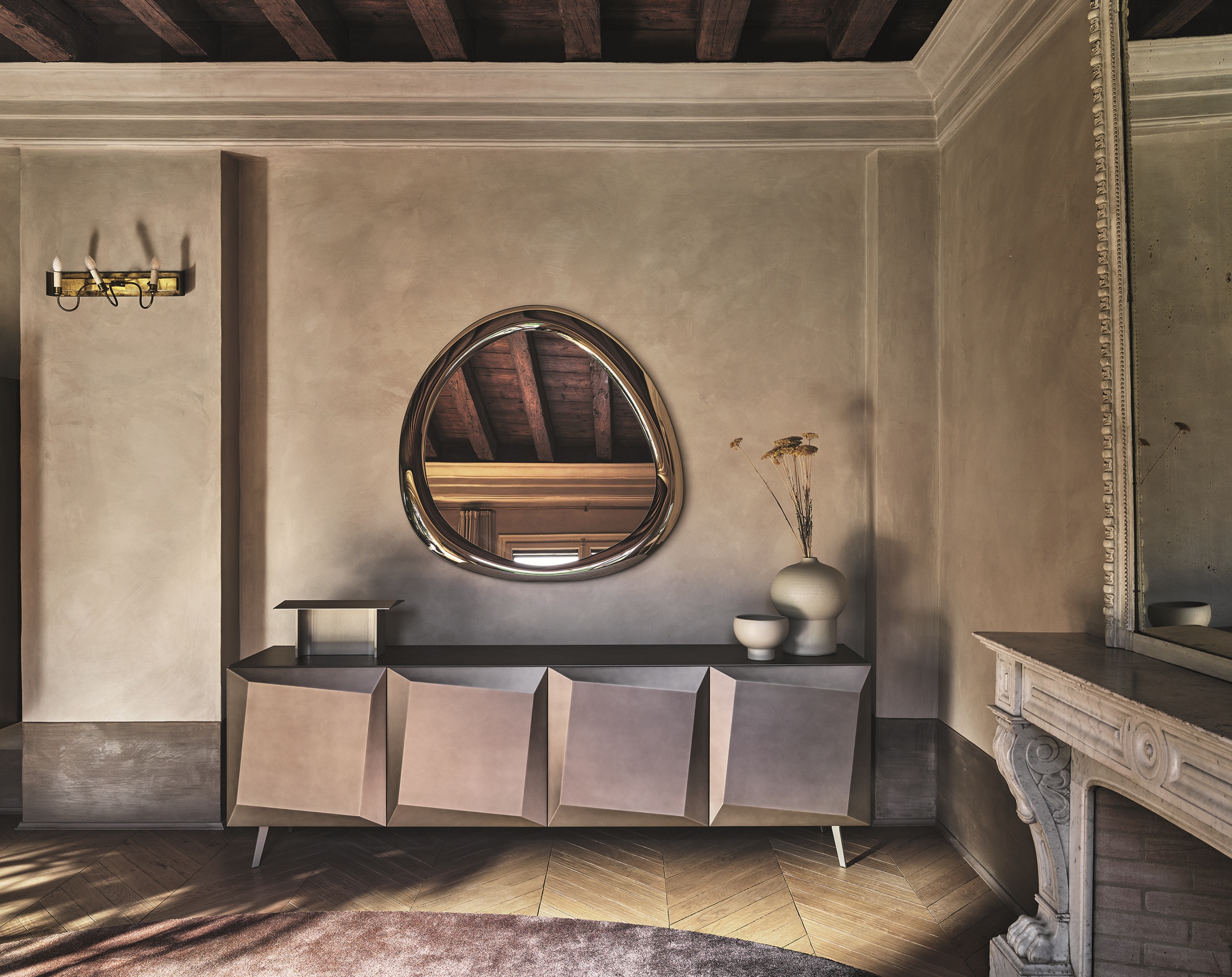 La collection surprend davantage encore par les nouveaux programmes de buffets modulaires, aux façades décoratives recherchées, qui renouvellent cette pièce de mobilier ayant une vocation avant tout fonctionnelle de rangement. C’est le cas avec le modèle Alterego (design Michele Menescardi), qui se distingue par ses portes de conception « tridimentionnelle » au design dissonant, qui en font une pièce presque sculpturale, en tout cas à la charge esthétique forte. Le buffet Crystal (design Gabriele et Oscar Buratti) est un autre exemple de cette créativité, avec ses portes en verre réinterprétées dans des versions bronze et fumé, dotées d’un rétro-éclairage intérieur en option, pour augmenter l’aspect spectaculaire de ce meuble. Autre création marquante, le buffet Intarsi, du même duo de designers, utilise la technique du motif en bois de placage au fil alterné, pour créer un effet visuel des plus décoratifs.