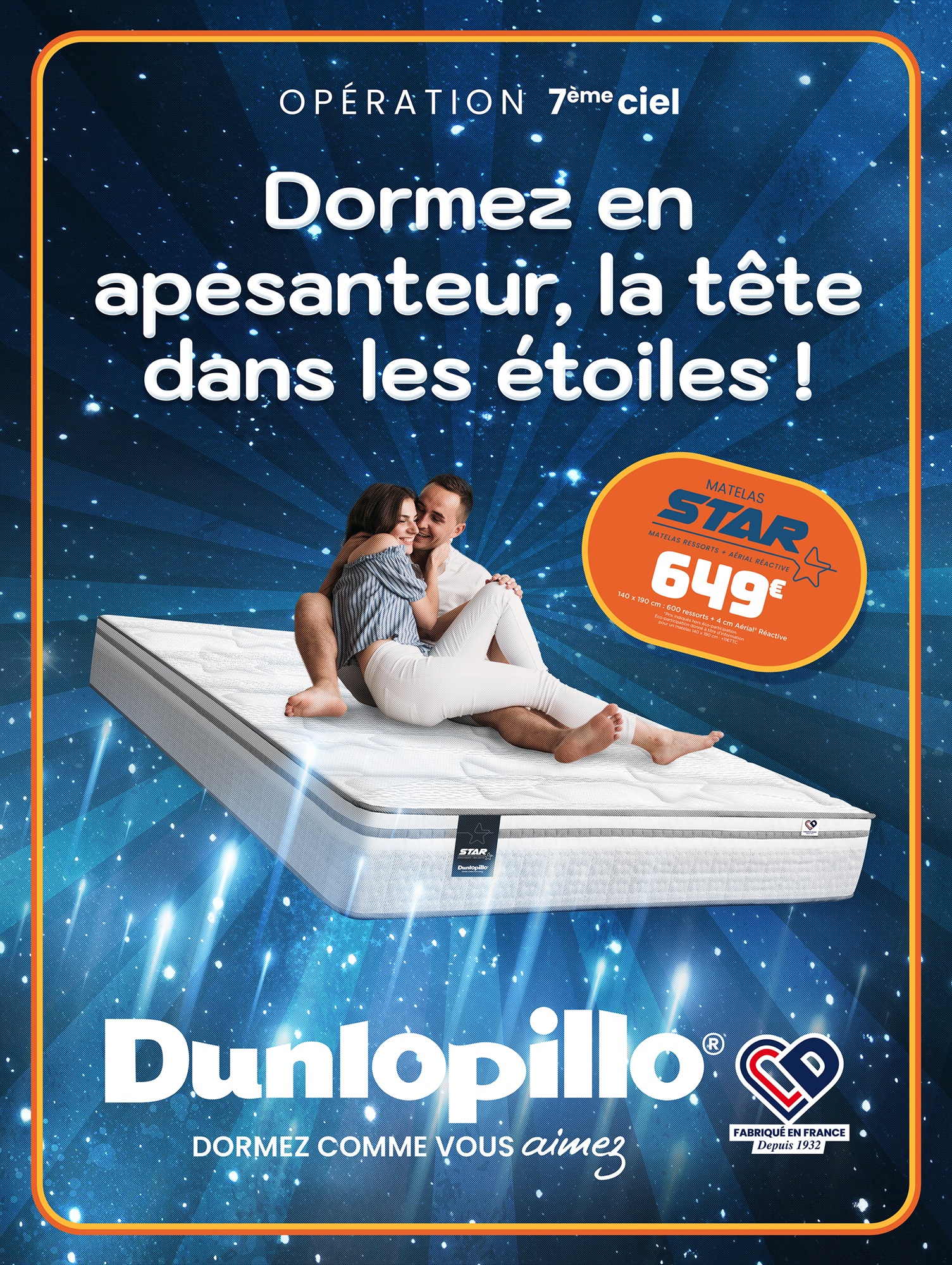 Forte du « succès » rencontré lors de la première édition, l'opération 7ème Ciel de Dunlopillo est actuellement de retour en ce début d’année 2026, et ce jusqu’à la fin du mois de février. Réalisé en exclusivité avec le réseau La Halle au Sommeil, ce temps fort commercial, conçu pour stimuler les ventes, met en avant, pour cette nouvelle édition, un modèle premium inédit, produit en série limitée : Star, associant 4 cm de mousse Aérial® Réactive à une suspension de 630 ressorts ensachés et cinq zones de confort, pour une épaisseur totale de 24 cm. Proposé au prix public « très attractif » de 649 € TTC (140*190), il mise sur une disponibilité rapide, puisque livré en dix jours maximum.